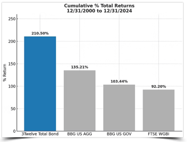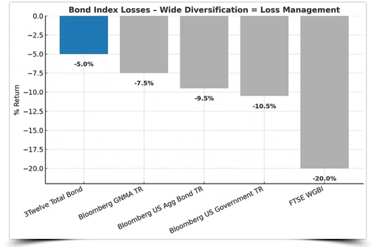 3Twelve Total Bond is an equally weighted, index-based strategy that invests in each major taxable bond category. The strategy, which seeks total return from income and capital appreciation, uses 12 major bond asset classes in an effort to enhance performance and reduce risk.