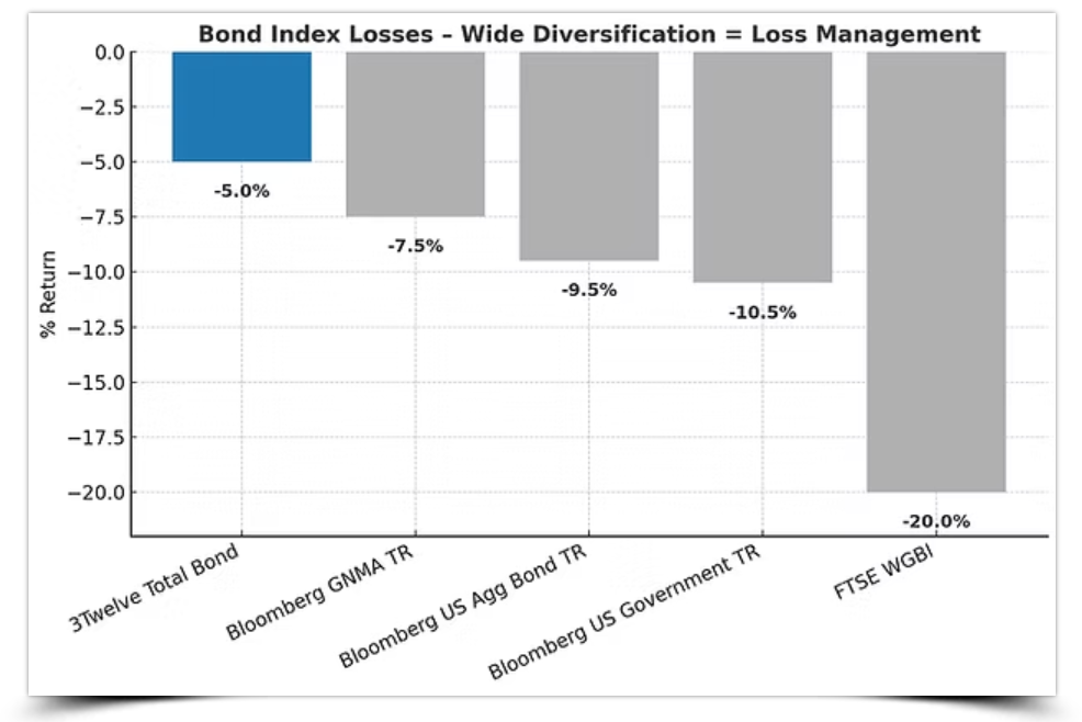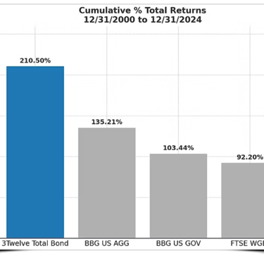 3Twelve Total Bond is an equally weighted, index-based strategy that invests in each major taxable bond category. The strategy, which seeks total return from income and capital appreciation, uses 12 major bond asset classes in an effort to enhance performance and reduce risk.